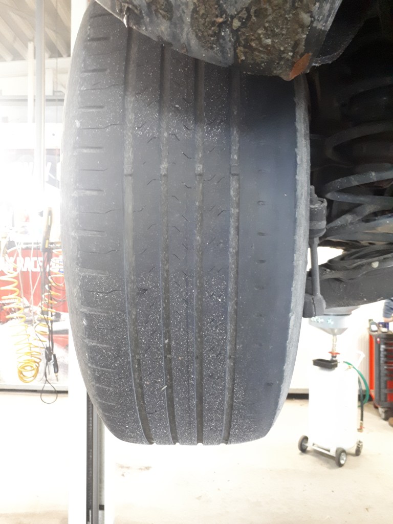 De banden achteraan tonen veel slijtage aan de binnenrand. Dit komt door te veel camber achteraan. Dit is deels oplosbaar door de sporing aan te passen.